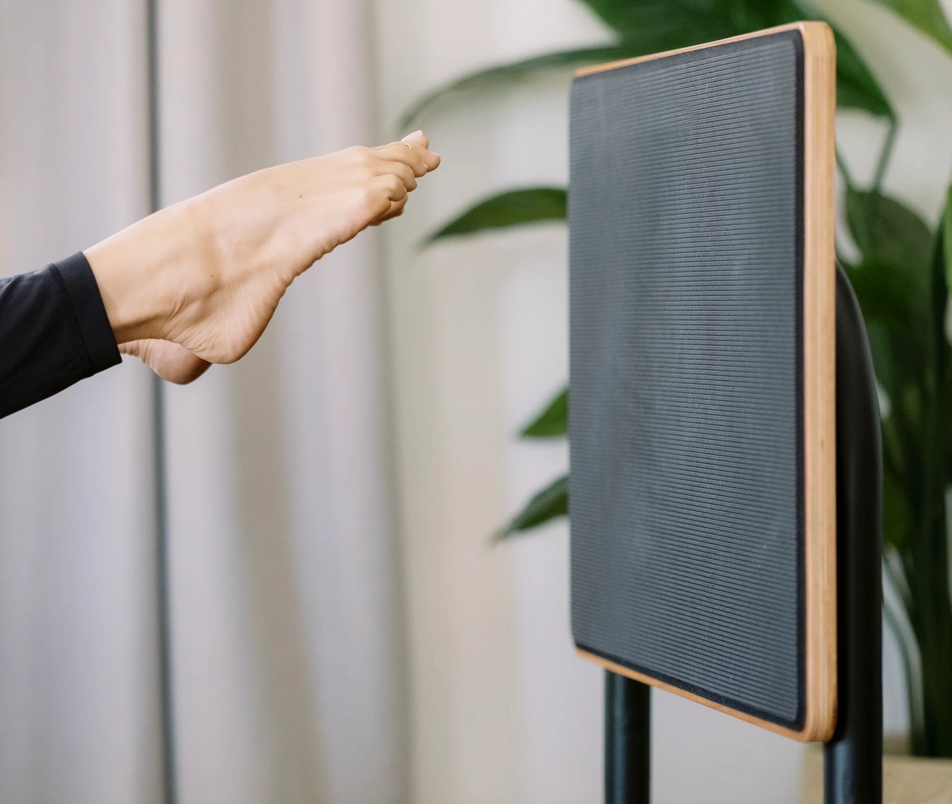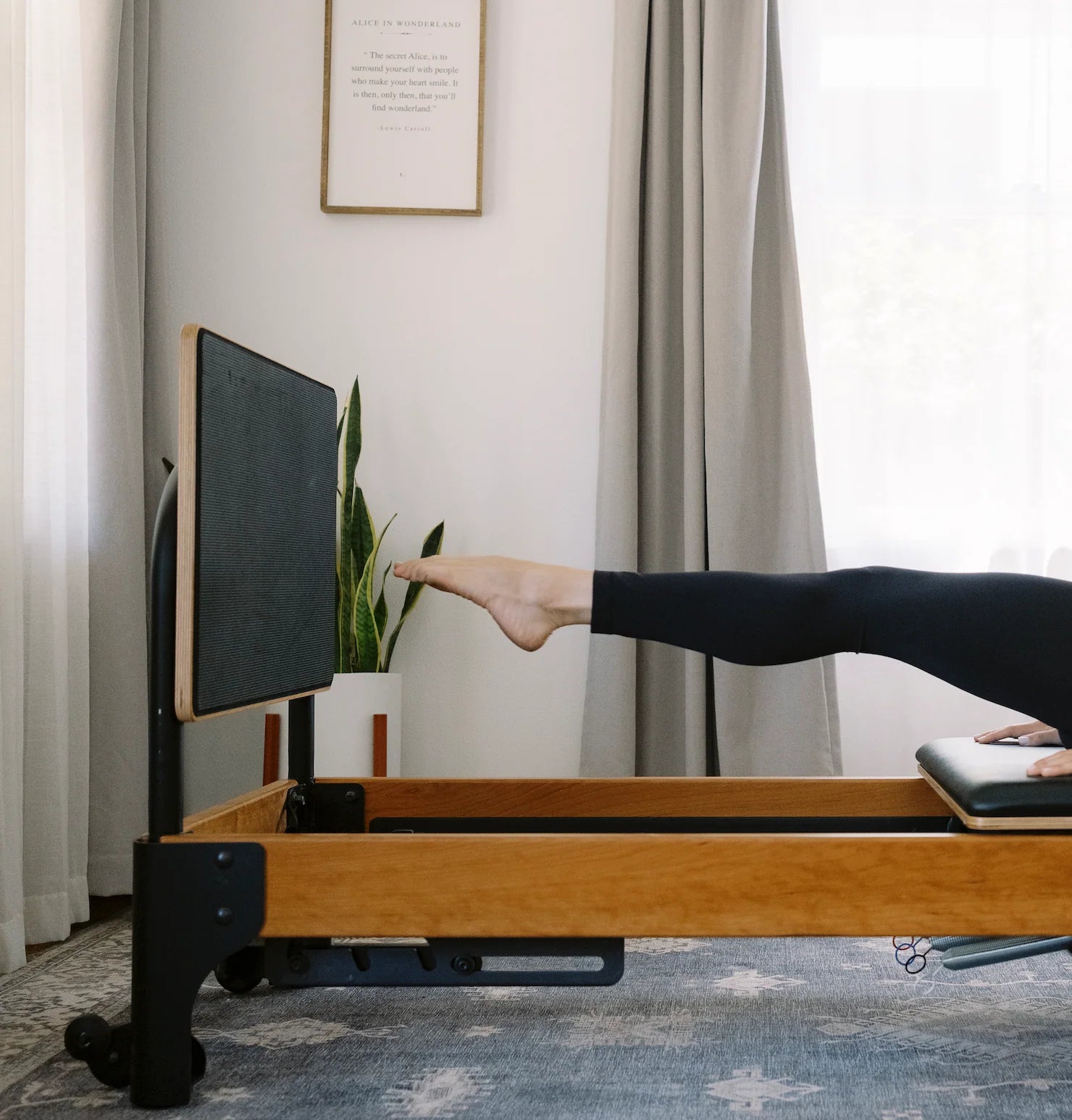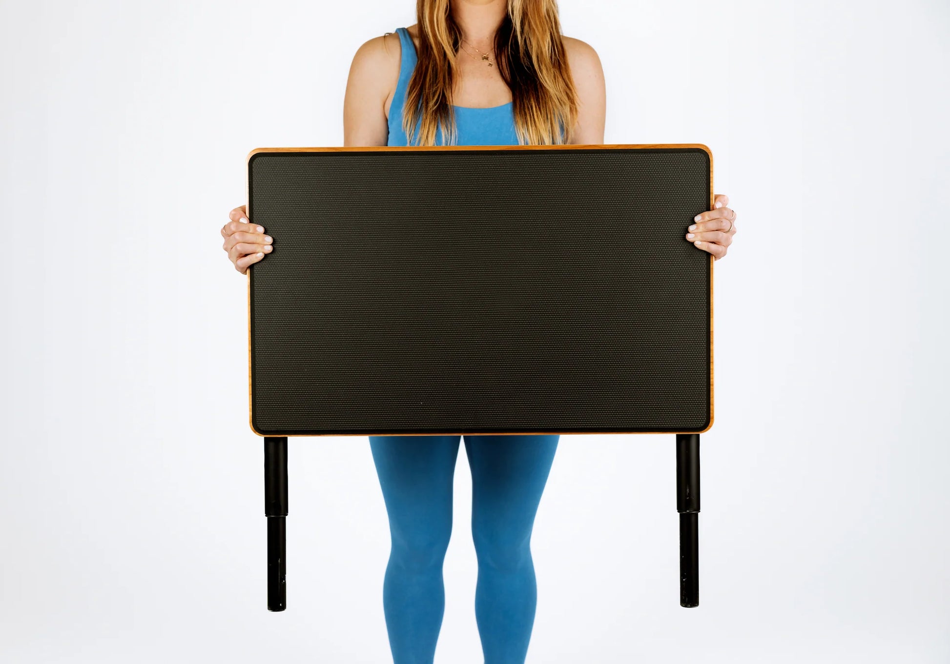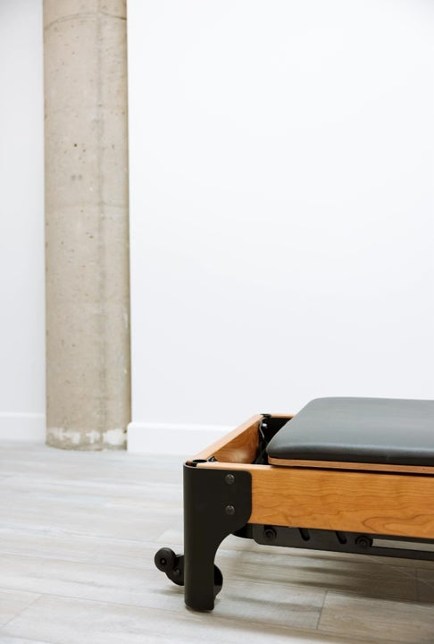 The Jumpboard is designed to slip securely into the Reformer’s corner brackets, completely replacing the footbar, for a snug, locked fit.